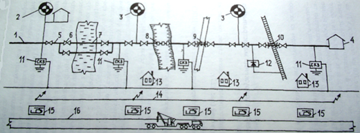 1 – подводящий трубопровод; 2 – головная нефтеперекачивающая станция; 4 – конечный пункт; 5 – линейная часть; 6 – линейная задвижка; 7 – дюкер; 8 – надземный переход; 9 – переход под автодорогой; 10 – переход под железной дорогой; 11 – станция катодной защиты; 12 – дренажная установка; 13 – дом обходчика; 14 линия связи; 15 – вертолетная площадка; 16 – вдольтрассовая дорога.