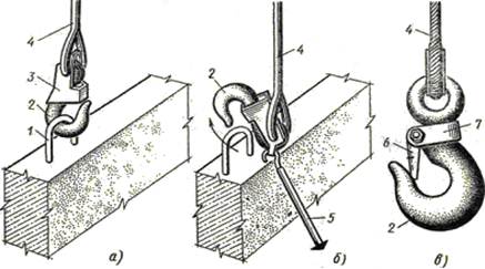Для расстроповки стеновых панелей, ригелей, перемычек, блоков грузозахватные устройства снабжают дистанционным устройством. Основные элементы такого устройства — карабин 3 и тяга 5 с крюком 2. Для расстроповки ослабляют стропы 4 и тягой 5 выводят крюк 2 из монтажной петли. Применяют также крюки с предохранительным устройством. Отжимная пружина 6, удерживающая груз, закреплена на крюке скобой 7 с болтом. Крюк заводят с внешней стороны стропуемого элемента.