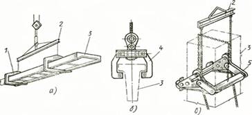 а—подхватами снизу, б — за выступающие части клещевым захватом, в — фрикционным захватом; 1 — консоли, 2 — траверса, 3 — конструкция, 4 — элементы захвата, 5 —прижимы захвата