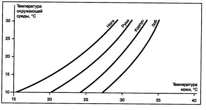 Рис 1. Изменение температуры кожного покрова различных участков тела в условиях покоя в зависимости от изменения температуры окружающей среды: