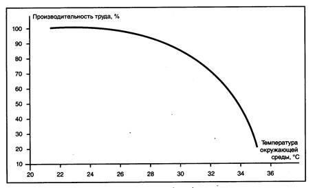 При этом могут наблюдаться и серьезные отклонения в организме человека. Например, у людей, попавших в условия "перегрева", повышается температура тела, резко снижается работоспособность, появляется повышенная раздражительность и т.п. На диаграмме (рис.2.) приведена зависимость производительности труда от изменения температуры окружающей среды. Как видим из графика, наблюдается резкое падение показателей производительности труда при превышении температуры более 26 'С.