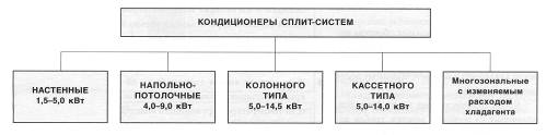 Внутренние блоки сплит-систем эффективно поддерживают заданную температуру, обеспечивают равномерное распределение воздуха в помещении и работают практически бесшумно. Основным преимуществом кондиционеров сплит-систем является относительная простота конструкции, позволяющая получить достаточно низкую стоимость кондиционера при быстрой и легкой его установке. Недостатком таких кондиционеров можно считать невозможность подачи в помещение свежего воздуха. Только модели большой мощности и настенно-потолочного типа позволяют организовывать подмес небольшого количества свежего воздуха (до 10%). Типология кондиционеров сплит-систем представлена на рис.3.