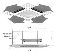 Еще один тип кондиционеров сплит-систем - кондиционеры кассетного типа, специально разработанные для больших помещений с подвесным потолком - операционных залов банков, офисов, супермаркетов. Они очень хорошо вписываются в интерьер помещения и во многих случаях их использование - единственное решение проблемы кондиционирования помещения (puc.8).