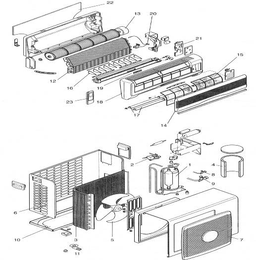 1-компрессор; 2-четырёхходовой клапан; 3-теплообменник-конденсатор; 4-звукоизоляция; 5-вентилятор; 6-кожух; 7-выходная решетка; 8-двухходовой клапан; 9-трехходовой клапан; 10-поддон; 11-сливной патрубок; 12-теплообменник-испаритель; 13-вентилятор тангенциального типа; 14-решетка; 15-входной фильтр; 16-направляющие жалюзи; 17-створки; 18-лицевая панель; 19-светодиоды; 20-датчики температуры; 21-плата управления; 22-монтажная плата; 23-пульт.