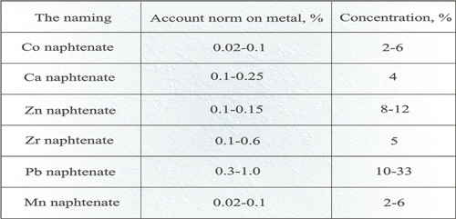 В настоящее время из-за высокой токсичности свинцовых сиккативов остро стоит вопрос о его замене (свинец обладает самой низкой предельно допустимой концентрацией (ПДК) в сравнении с другими Pb, Co, Mn, Al, Zn - 0.15; 0.3; 0.5; 2.0; 5.0 мг/м . в кубе соответственно). Для решения этой проблемы предлагается изготовление сиккативов на основе Co, Mn, Zn, Ca, Zr и природных экологически чистых дистиллированных нафтеновых кислот.