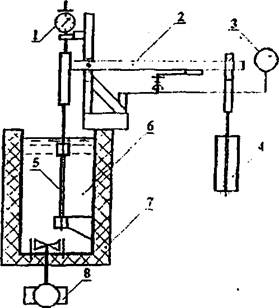 1 - стрелочный индикатор. 2 - рычаг для передачи силы; 3 - прибор учета времени, 4 - ксштролы/ьш фул 5 обраюц; 6 - испытательная среда; 7-теплошояярованная ванна. 8-насос для циркуляции жидкости