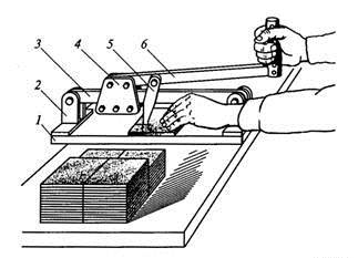 Рычажной плиткорез (рис. 1.12.15.) состоит из основания 1 с двумя стойками 2, соединенными между собой направляющими 3. Между направляющими двигается каретка 4, имеющая внизу резец 5, а вверху рычаг 6. Рычаг передвигает каретку вдоль направляющих и резцом надрезает плитку.