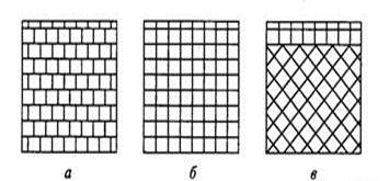 Рис.1.12.16. Способы облицовки стен глазурованными керамическими плитками: а – вразбежку; б – шов в шов; в – по диагонали