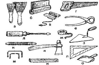 а — шпатель с резиновым наконечником и зубчатый; 6 — широкий зубчатый шпатель, в — отвес; г—пила (ножовка), д — отвертке, е — клещи (кусачки), ж—рулетка; 3 — лопатка; и — зубило; >с — топорик-молоток; п —угольник, м — скобь; н — уровень; о — шпатель-совок