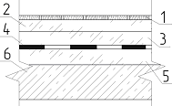 1- керамические плитки- 15; 2- прослойка и заполнение швов из цементно-песчаного раствора М-150- 20; 3- стяжка- 20; 4- гидроизоляция; 5- стяжка из цементно-песчаного раствора- 20; 6- ж/б плита перекрытия- 220 |