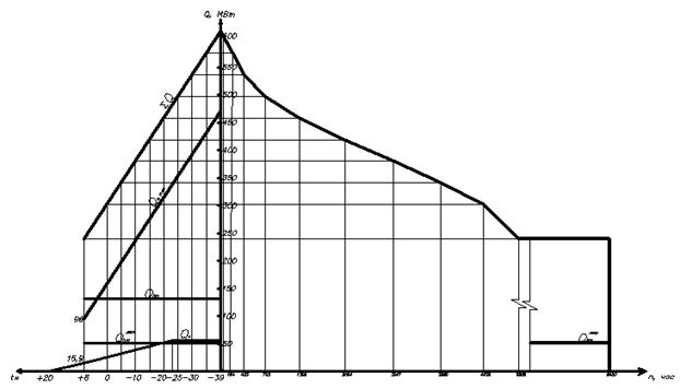 При построении часового графика выделяют три переломные точки при наружной температуре: tн = 8 ºС, tв = 20 ºС, tно = -39 ºС.