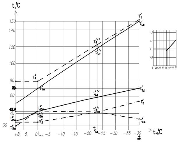 Находим τ2,в при температуре наружного воздуха в точке излома tни = -0,4 ºС (рис.3). При tни =- 0,4 ºС, τ 1,0 = 70 ºС.
