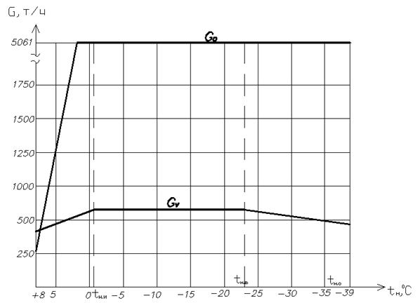 Зная температуру воды на выходе из калориферов, определяется расходы сетевой воды на вентиляцию при различных температурах наружного воздуха: