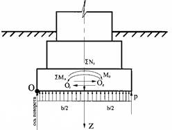 где Ми и Mz - соответственно моменты опрокидывающих и удерживающих сил относительно оси возможного поворота (опрокидывания) фундамента, проходящей по крайним точкам О опирания, кН∙м; т= 0,8 - коэффициент условий работы; γn = 1,1 - коэффициент надежности по назначению.