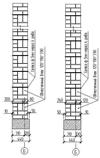 Наружные стены по оси Б запроектированы смешанного типа из силикатного кирпича (размеры 88*120*250) и облегченного кирпича (размерам 120*190*390) толщиной 380мм на растворе марки М 75. При этом кладка стены по оси Б должна сдвигаться на 40мм при этом образовывая архитектурные ниши как с внутренней стороны так и с наружной (фасад) (см.Рис.1 или чертеж в прилож.). Высота нишь должна быть выполнена до отметки +3,200м