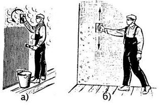 Грунт перед нанесением накрывочного слоя смачивают водой при помощи кисти. Раствор набрасывают на поверхность кельмой, разравнивая его полутерком волнообразными движениями снизу вверх. После того как накрывочный слой немного подсохнет, а штукатурный слой уже не плывет, но еще влажный, следует начинать затирку. Затирка осуществляется теркой. Для этого ее берут в правую руку, плотно прижимая к штукатурке, и перемещают по поверхности вкруговую против часовой стрелки. При этом отдельные бугорки срезаются теркой, а срезанный раствор попадает в углубления, что способствует выравниванию поверхности. Если все же после затирки остаются раковины, добавляют некоторое количество раствора и затирают их. При подсыхании накрывочного слоя до начала затирки его смачивают водой с помощью кисти. (рис. 11).