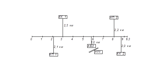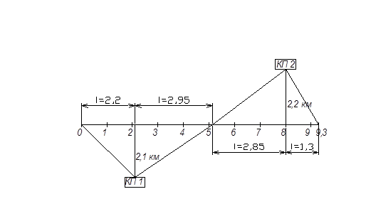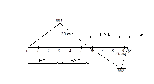 При определении границ зоны действия карьеров условно предполагаем, что качество песка, сложность его разработки в обоих карьерах одинакова, тогда границей зоны обслуживания карьеров одинаково удаленная от КП 1 и КП 2 (для песка), а также от ККМ 1 и ККМ 2 (для каменных материалов).