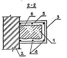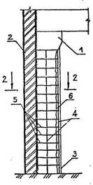 1 - усиливаемая колонна; 2 – стена; 3 – железобетонная рубашка; 4 – продольная арматура; 5 – хомуты; 6 – подготовленная к обетонированию поверхность колонны (насечка, зачистка).