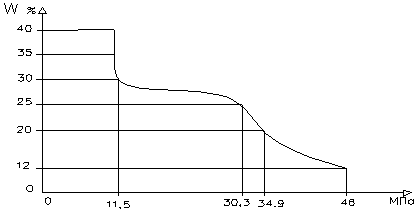 Пиломатериал из сосновой древесины при стандартной влажности и температуре 18 ˚С имеет предел прочности при сжатии 46 МПа. Определить предел прочности древесины при влажности 20, 25, 30, 35 и 40 %. Построить графическую зависимость между прочностью и влажностью древесины.