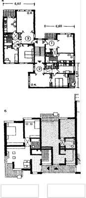 Во всех квартирах секции предусмотрены большие светлые передние с лоджиями при них (курсовой проект) МАрхИ) (а). Проходная общая комната — общий принцип планировочной организации всех квартир в доме (ФРГ) (б).