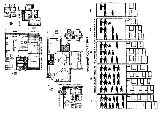 Отсюда следует, что нельзя сделать однозначного вывода о преимуществах одного вида расселения перед другим для всех семей одного численного состава. Все зависит от их демографического типа, что проявляется прежде всего в требованиях к набору и числу помещений, предназначаемых для размещения спальных мест. Анализ изображенной схемы позволяет заключить, что требуемые разновидности таких помещений, их число и состав в жилой ячейке зависят главным образом не от размера семьи, а от ее внутренней структуры. Этот вывод подводит и к другому важному положению-на одной и той же площади необходимо проектировать квартиры разных планировочных достоинств, соответствующих разным формам образа жизни различных семей одной численности. Нормируемые общие площади на квартиру, предусмотренные действующими СНиП, при отсутствии регламентации на жилые помещения ориентируют на подобный метод, называемый вариантным проектированием квартир - метод, научно обоснованный и проверенный экспериментально.