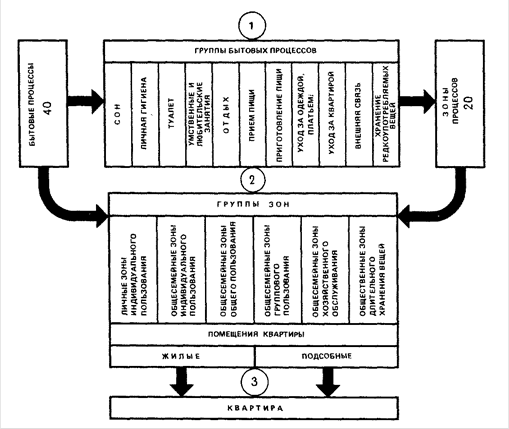Функциональные основы проектирования квартир I - бытовые процессы, характерные для различных семей при любом образе жизни объединены в группы по пространственным условиям их выполнения. По сходству требований к изоляции осуществления бытовых процессов создана номенклатура зон бытовых процессов; 2 - по характеру пользования зонами они разделены на шесть групп, определяющих формирование номенклатуры двух видов помещений (жилые и подсобные). Число зон в помещении определяется его функциональной нагрузкой; 3 - число помещений, составляющих квартиру, зависит от уровня обеспеченности жилищем в каждый период строительства и степени дифференциации зон.