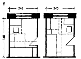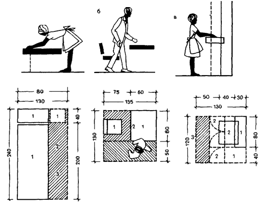 Итак - зона бытового процесса - это пространство, в котором осуществляется тот или иной процесс жизнедеятельности, имеющее условные границы. Параметры пространства устанавливают на основе антропометрических и эргономических требований. В соответствии с этим предусматриваются: постановочная часть зоны, т.е. пространство, на котором размещается необходимая для данного процесса мебель, или иное оборудование; рабочая часть зоны - пространство, которое необходимо для открывания дверец шкафа, отодвигания кресел, стульев и пр.; резервная часть площади зоны - пространство для человека - как обязательное условие удобного осуществления бытового процесса. Использование зон в качестве расчетных элементов формирования помещений можно видеть на примерах рис.7, Б. Поскольку зоны обладают определенной самостоятельностью, их можно комбинировать и располагать различным образом относительно друг друга, но в соответствии с требованиями их функциональной взаимосвязи, освещения, привязки к стенам, месту окон и дверей в помещении. При необходимости возможно совмещение зон, но только в части резервных площадей. В любом случае должны сохраняться минимальные размеры между крайними предметами мебели соседних зон.