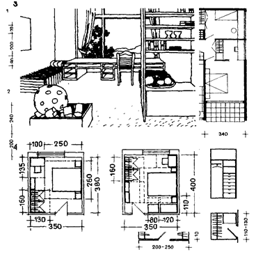 Основные зоны в указанных типах помещений следующие: зона сна и индивидуального отдыха; зона размещения платья и белья; зона индивидуальных занятий и зона размещения личных вещей культурно-бытового назначения. Примеры структурной организации жилых помещений всех трех типов с тем или иным составом указанных зон. Рациональное размещение зон приводит к экономии площади. Так, например, рекомендуемый нормами минимум 8 м для одноместной жилой комнаты оказывается вполне достаточным, чтобы распределить необходимый состав мебели в различных вариантах расстановки, не создавая затесненности помещения. Жилая комната площадью 12 м для двух членов семьи может удовлетворить потребности каждого, а спальня родителей 13-15 м позволяет разместить в ней детскую кроватку.