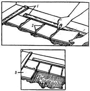 1-деревянные планки; 2-прокладки; 3-второй ряд