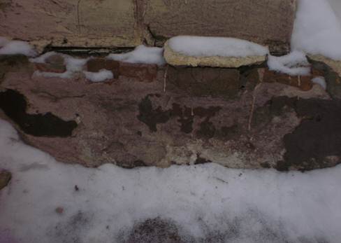 Разрушению цокольной части здания способствует малый вылет карнизной части кровли, из-за чего влага попадает на стены цоколя и происходит из замораживание и оттаивание, разрушающее наружную часть стен. При организованном водоотводе с кровли важно надежное устройство мест водосброса из труб ливневой канализации с тем, чтобы исключить попадание влаги на цоколь.