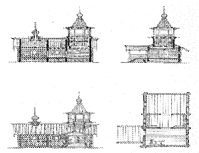 Попытка восстановить кровлю, общую для старой и новой части памятника, была бы ошибочной. Такой кровли здесь никогда не было, да и быть не могло хотя бы потому, что постановка нового крыльца, его размеры и формы исключают саму возможность устройства здесь потока. А общая двухскатная кровля никогда не совмещает в себе одновременно два типа конструкции-по потокам и курицам и обычную. Таким образом, вывод напрашивается сам собой-реставрировать следует обычную кровлю.