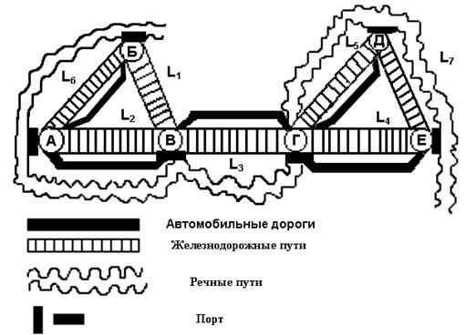 различными видами транспорта необходимо, чтобы в каждом пункте транспортной сети существовали все варианты видов собщения, то есть и автомобильные дороги, и речные пути и железные дороги.