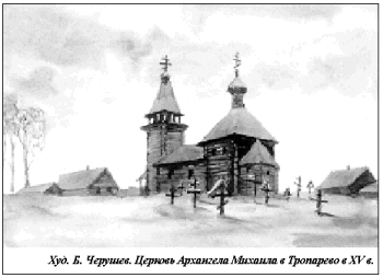 В первые годы XVII столетия – в Смутные времена – деревянная церковь Чуда Архангела Михаила была сожжена, но вскоре храм возродился вновь. Переписная книга 1646 года уже отличает: “А в селе церковь Архангела Михаила древяная, у церкви во дворе поп Андрей Захаров”.