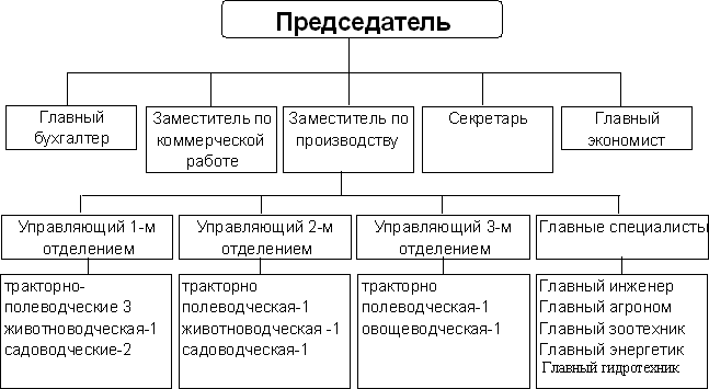 Управляющие отделений вместе с главными специалистами хозяйства, отвечающими за сельскохозяйственное производство подчиняются заместителю председателя коллективного сельскохозяйственного предприятия по производству.