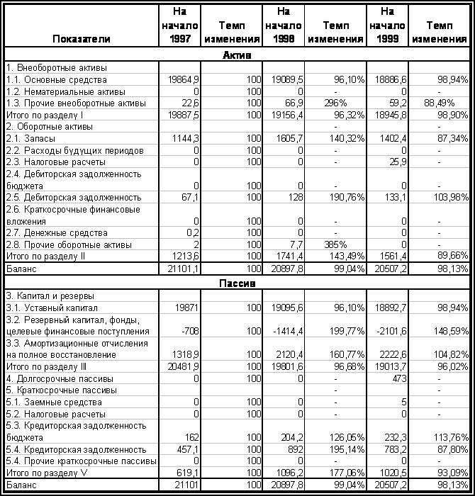 Данные таблицы 2.2 свидетельствуют о том, что валюта баланса снизилась на 0,96 % за 1997 г. и на 1,87 % на начало 1999 года в сравнении с началом 1998 г. Данное снижение произошло из-за уменьшения суммы внеоборотных активов на 3,68 % в 1997 г., 1,1 % в 1998 г., несмотря на то что оборотные средства на