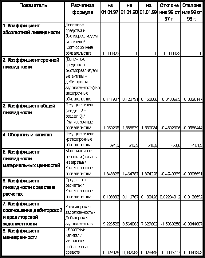 Из таблицы 2.3 видно, что баланс предприятия является ликвидным, так как оно имеет чистый оборотный капитал и его текущие активы превышают текущие обязательства на 594,5 тыс. грн. на начало 1997 г., 645,2 тыс. грн. на 01.01.98 г. и 540,9 тыс. грн. на начало 1999 г. Однако нельзя сказать, что предприятие имеет абсолютно ликвидный баланс, так как коэффициент абсолютной ликвидности на 01.01.99 г. равен 0, ведь хозяйство не располагает денежными средствами , в мировой же практике считается достаточным, если величина этого коэффициента составляет 20-30%. Однако это высказывание нельзя принимать с полной уверенностью, так как в балансе отражаются средства на определенный момент времени, а деньги могут поступить через 2-3 дня после его составления.