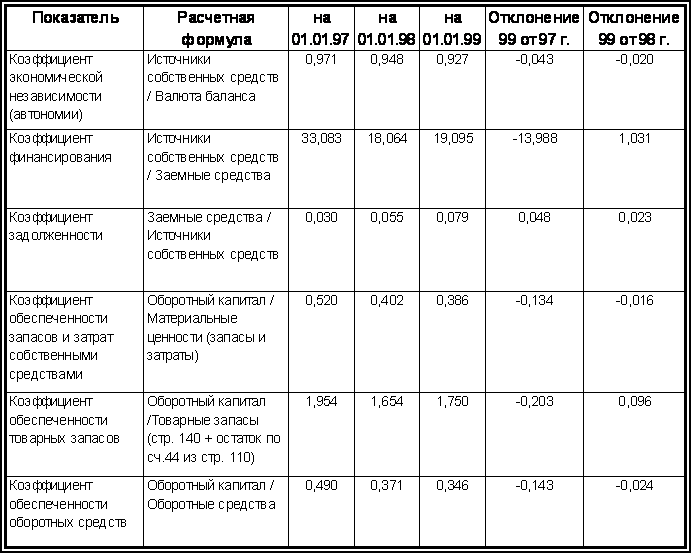 Данные расчетов свидетельствуют об ухудшении финансового состояния предприятия. Так коэффициент экономической независимости уменьшился в сравнении с началом 1998 г. на 2 %, то есть на конец периода предприятие 92,7 % имущества покрывало за счет собственных средств.