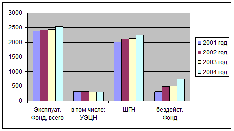 Проведенный анализ динамики фонда скважин за последние 4 года показывает (см. гистограмму), что эксплуатационный фонд скважин по НГДУ «ЛН»с 2001 года по 2004 год вырос с 2387 скважин до 2530. При этом происходит уменьшение ввода скважин, оборудованных УЭЦН. Это связано с тем, что по НГДУ ежегодно проводятся геолого-технические мероприятия, направленные на снижение обводненности добываемой продукции. К эти методам относятся закачка в пласты различных изоляционных материалов, таких как НБП, СНПХ9633 и др.