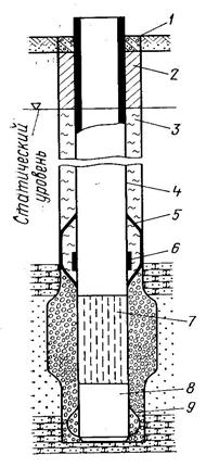 1 – цементное кольцо; 2 – тампонажный слой глины; 3 – глиноизвестковый раствор; 4 – полиэтиленовая колонна; 5 – гидравлический пакер; 6 – клапан; 7 – фильтр; 8 – отстойник; 9 – направляющий фонарь