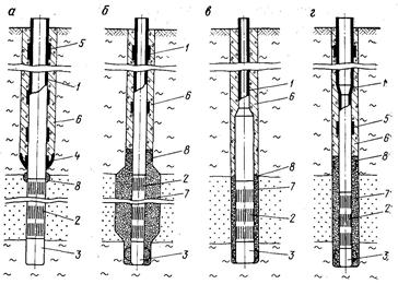 В последнее время технологические скважины ПВ оборудуются фильтрами с гравийной обсыпкой. С целью создания на забое скважины уширенного контура гравийной обсыпки призабойная зона скважины может предварительно расширяться (рис. 5. б).