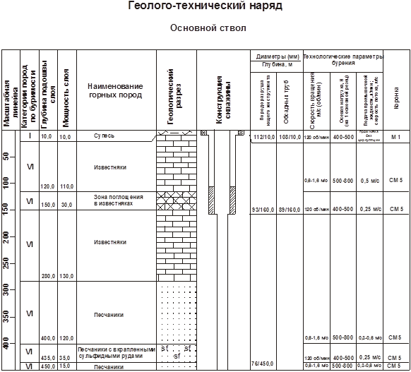 Выбирают конструкцию скважины снизу вверх. После выбора конструкции скважины выбирают буровую установку, затем составляют спецификацию необходимого бурового оборудования и инструментов, определяют режимы бурения для каждого типа породы в отдельных интервалах и разрабатывают геолого-технический наряд на строительство скважины (табл. 4.1.). Он будет служить основным документом - руководством для буровой бригады. В нем в табличной форме имеется информация по геологическому разрезу, конструкция скважины и рекомендуемые параметры режима бурения.