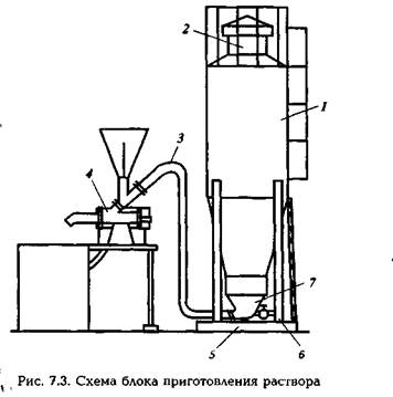 Наиболее широко применяется БПР, выпускаемый Хадыженским машзаводом. Он представляет собой (рис. 7.3) два Цельнометаллических бункера 1, которые оборудованы разгрузочными пневматическими устройствами 7, резинотканевыми гофрированными рукавами 3 и воздушными фильтрами <?• В комплект БПР входит выносной гидроэжекторный смеситель 4, который монтируется непосредственно на емкости ЦС и соединяется с бункером гофрированным рукавом.