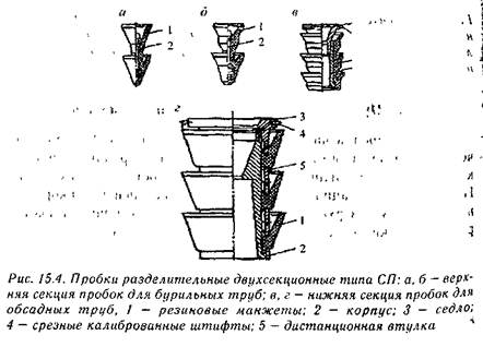 При цементировании хвостовиков и секций обсадных колонн, спускаемых на бурильных трубах, применяют верхние двухсекционные пробки СП (рис 15.4) Они состоят из двух частей' нижней, подвешиваемой па срезных калиброванных штифтах в обсадной трубе, соединенной с бурильной колонной, и верхней, предварительно размещаемой в цементировочной головке и прокачиваемой по бурильным трубам,