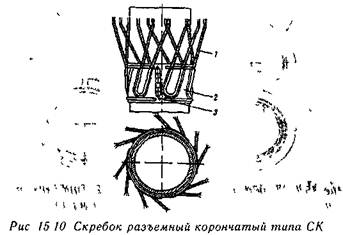 Скребок корончатый разъемный типа СК состоит из корпуса 2, половинки которого соединяются с помощью штыря 3 Рабочие элементы скребка 1 выполнены из пучков стальной пружинной про волоки и прикреплены к корпусу накладками (рис 15.10). Скребок комплектуется стопорным кольцом с фиксирующимся на трубе спиральным клином