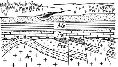 Но не все древние горные сооружения были вовлечены в повторное горообразование. Большая их часть после выравнивания медленно опускалась, была залита морем, и на реликты горных массивов наслоилась толща морских осадков. Так сформировались платформы. В геологическом строении платформ всегда присутствуют два структурно-тектонических этажа: нижний, сложенный метаморфизированными остатками былых гор, являющий собой фундамент, и верхний, представленный осадочными горными породами (рис. III.7).