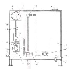 Рис. 4 Дозировочная установка УДЭ. 1- дозировочный блок, 2 – электроконтактный манометр, 3- указатель уровня, 4- заливная горловина, 5 – бак, 6 – фильтр, 7 – рама, 8 – сливной вентиль, 9, 10, 15 – вентили, 11 - всасывающий трубопровод, 12 – обратный клапан, 13 – электронасосный агрегат, 14 – нагнетательный трубопровод, 16 – кожух.