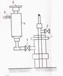 – задвижка затрубного пространства, 4 – резервуар для реагента, 5 – заглушка, 6 – вентиль.