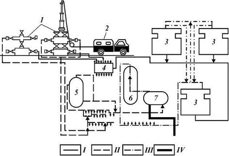 Основными элементами этой схемы являются: скважины 1, компрессорные станции 3, газопроводы высокого давления, трубопроводы для сбора нефти и газа, сепараторы различного назначения 7, газораспределительная батарея 4, групповые замерные установки, системы очистки и осушки газа с регенерацией этиленгликоля 6, дожимные насосные станции, нефтесборный пункт,