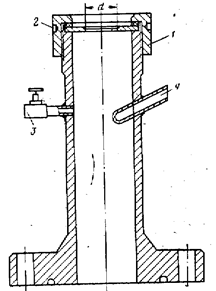 Измеритель критического течения подключается к устью скважины через сепаратор (породоуловитель). Противодавление в скважине создается диафрагмой диаметра d, помещенной в головке ДИКТа 1 с помощью прижимной гайки 2. Давление