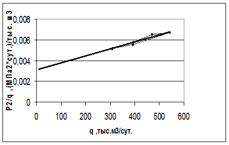 По данным, приведенным в таблице №7.5, можно построить индикаторную кривую (Рис. 5). Отрезок отсекаемый этой кривой на оси ординат равен коэффициенту фильтрационного сопротивленияА, а коэффициент В как тангенс угла наклона к оси. Из рис. 5 можно определить, что А=0,0031 и В=0,00000255.